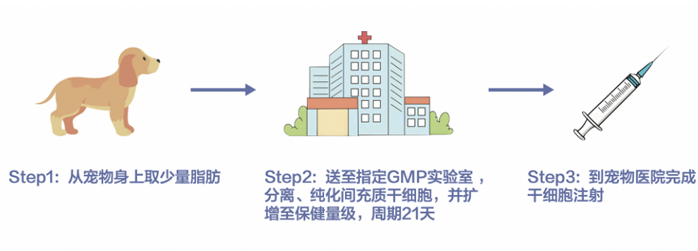 从宠物自身提取脂肪组织,在无菌条件下分离出间充质干细 胞。然后在模拟体内生理条件下进行培养、扩增,经过3代传代获得纯化的干细胞, 建立种子细胞Bank。由细胞Bank提取种子细胞做进一步的传代、培养、扩增,获 得的间充质干细胞可以达到活性峰值,数量充足,可以注射回宠物自身,满足保健 的需要,缓解宠物自身各种不适。